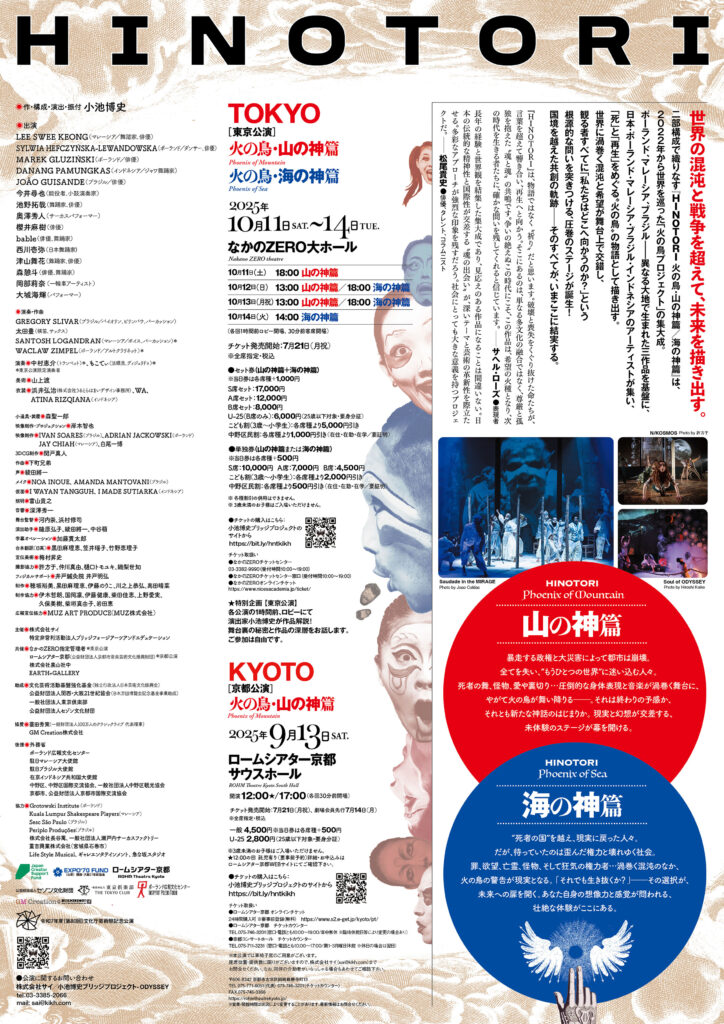 2部構成で紡がれる本公演は、2022年より世界4カ国で展開してきた「火の鳥プロジェクト」の集大成です。日本、ポーランド、マレーシア、ブラジル、インドネシアのアーティストたちとともに、「死」と「再生」の象徴である“火の鳥”伝説に想像力を重ね、現代社会に響く物語を立ち上げます。