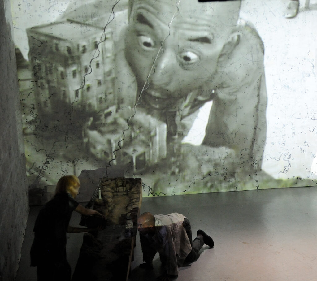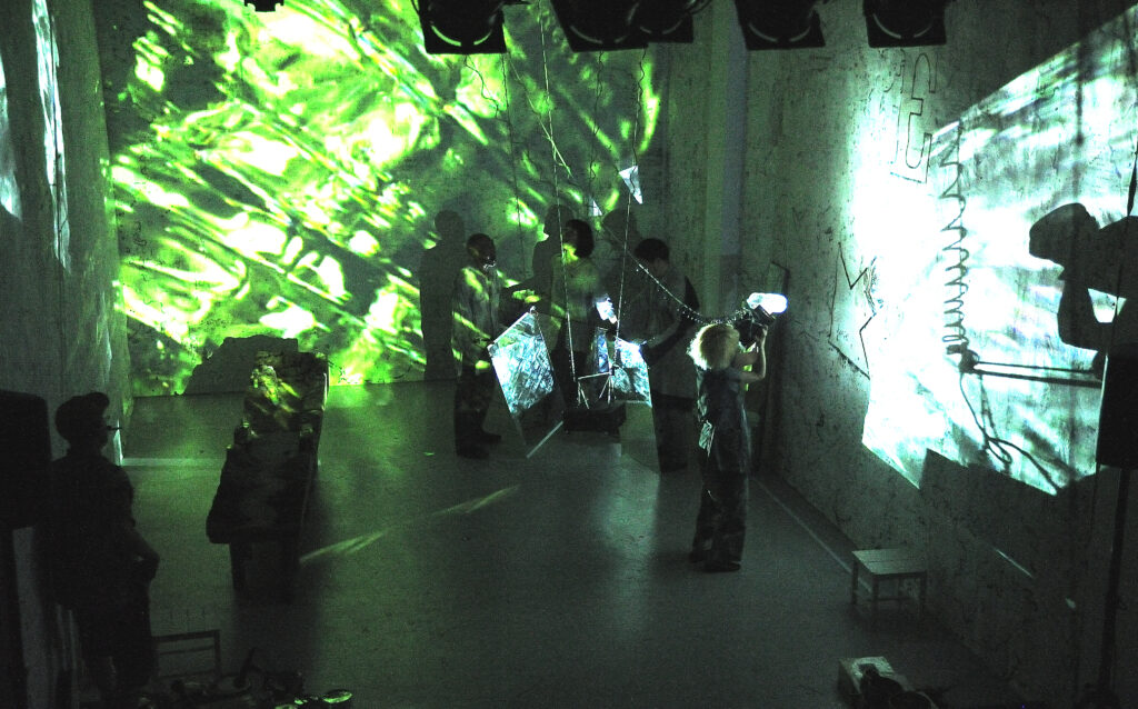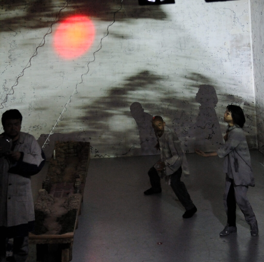 ライブ映像、映画、オブジェ、動き、踊り、声の重なり、ガラクタからの音が縦横に絡み合う…